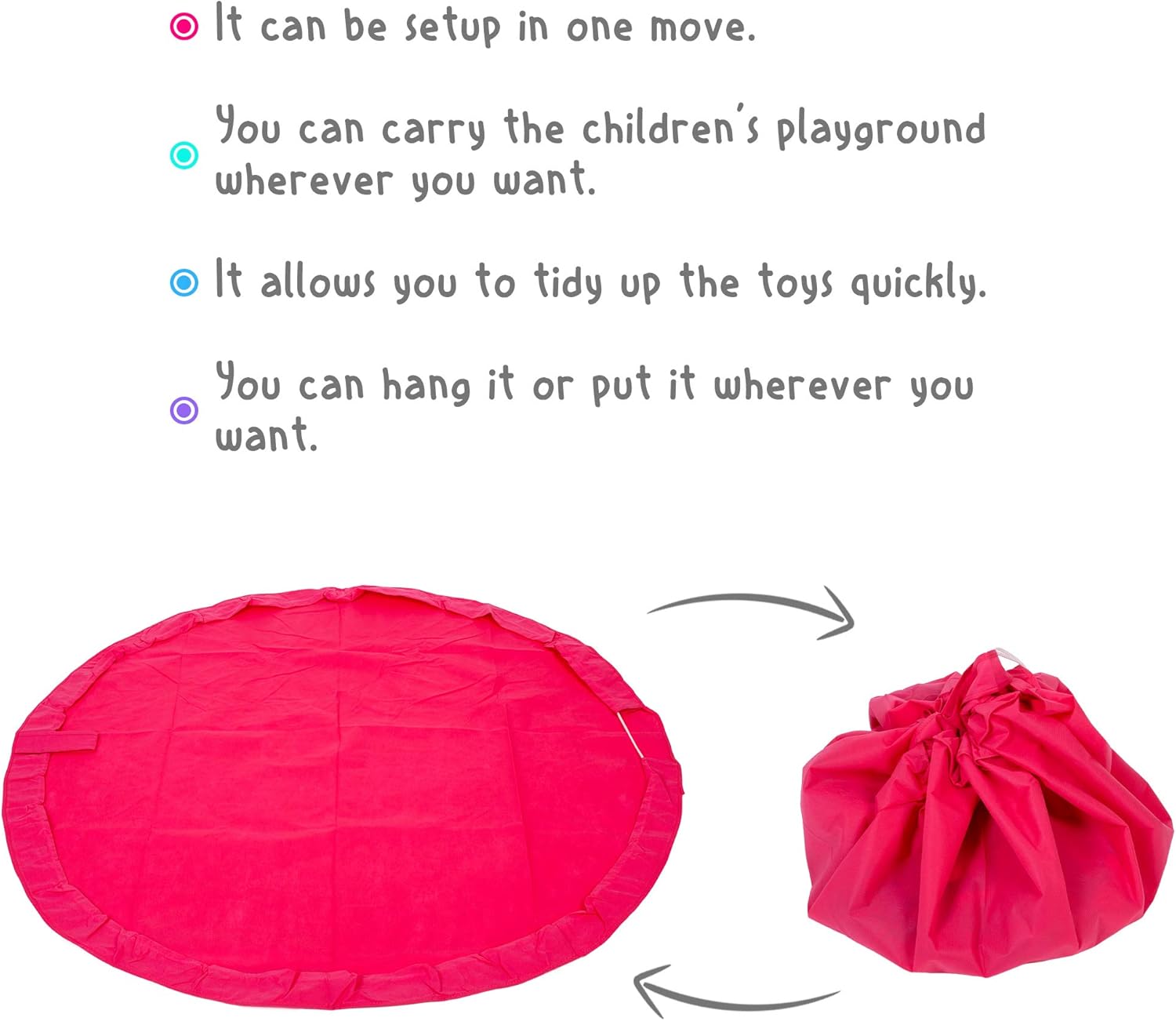 • STYLISH, DURABLE, AND FUNCTIONAL: Made of soft but strong material, the Tosy Storage Bag and Playmat will last for many years to come. It not only meets your fashion needs but also has great practicality. It will keep your kids’ toys contained and organized when not used. To clean up, pull the string to collect and enclose the toys and the playmat will turn into a storage bag in no time. Now you can carry and store them anywhere you like.