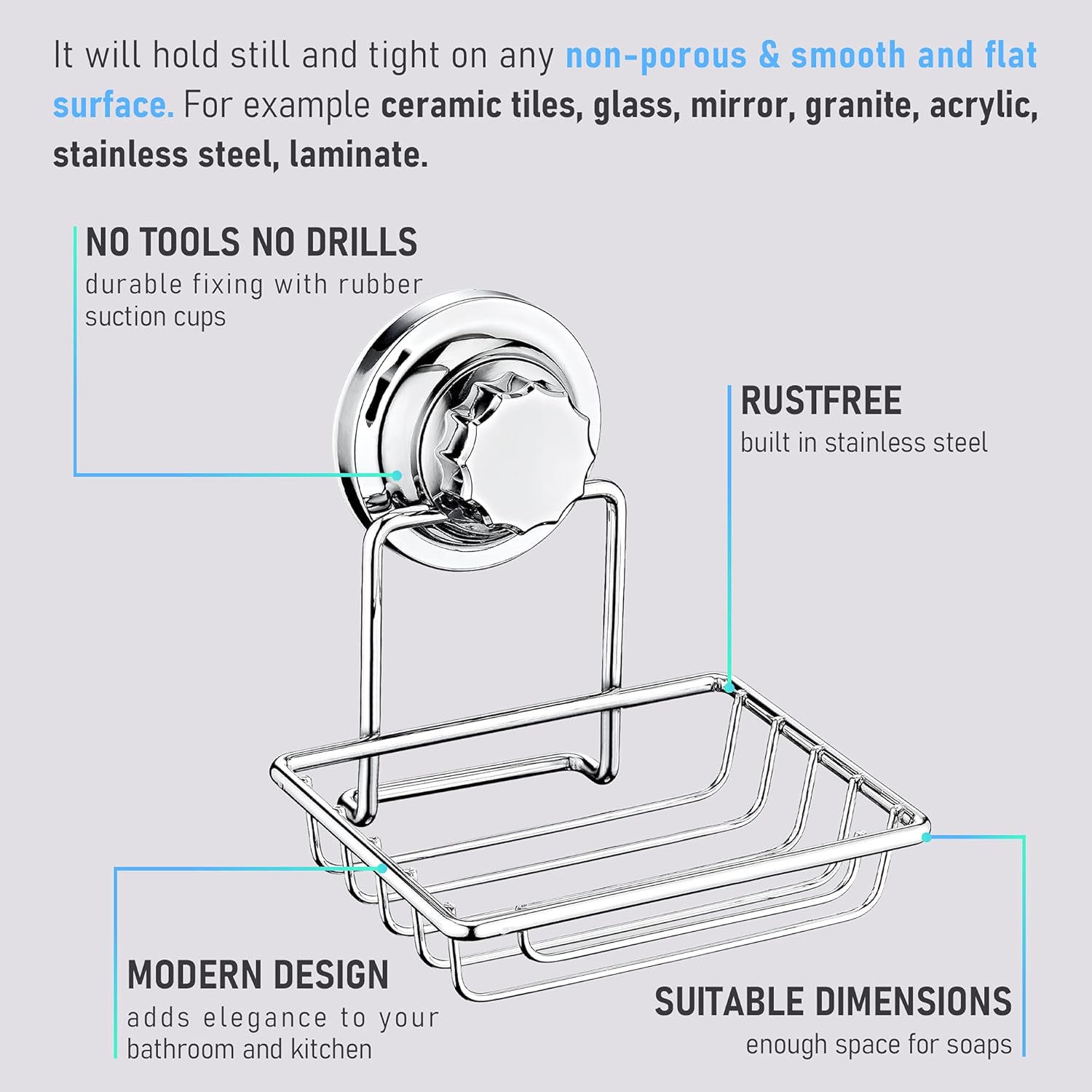 - KEEP YOUR WALLS INTACT: When using your EDNA HOME soap bar caddy, there will be no need for extra tools, drilling, screws holes, and bolts. The suction cups and the basket have hand-polished stainless-steel finishing, and they are built to resist daily potential scratches, corrosions, discoloration, or tarnishing. Optionally, the holder can be mounted using two-sided tapes or screws as well.